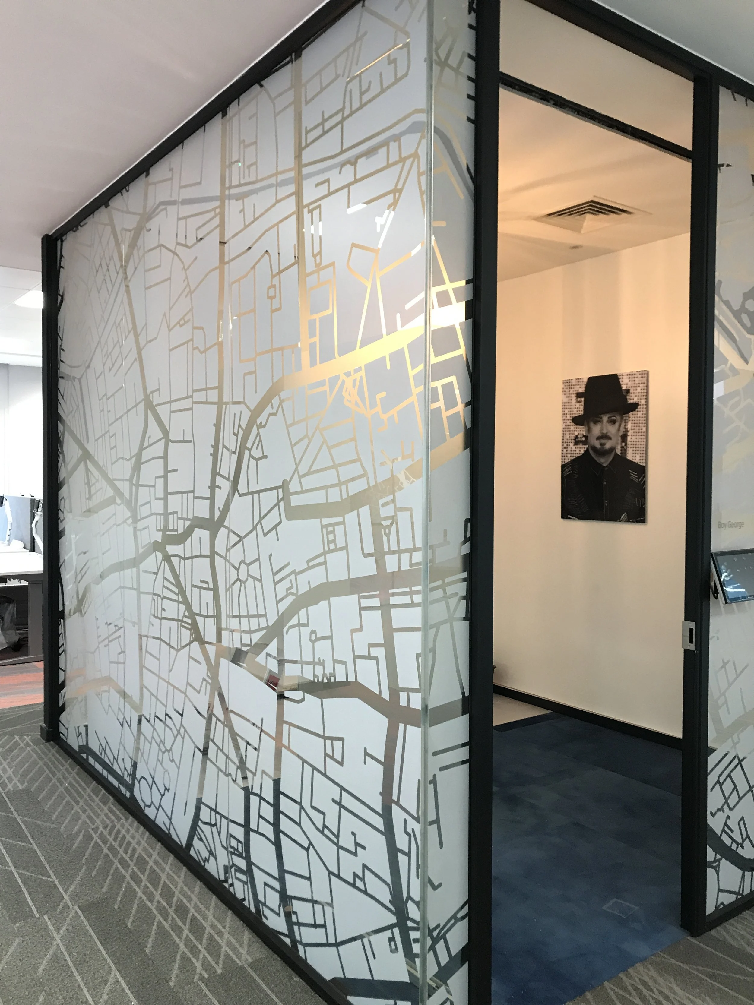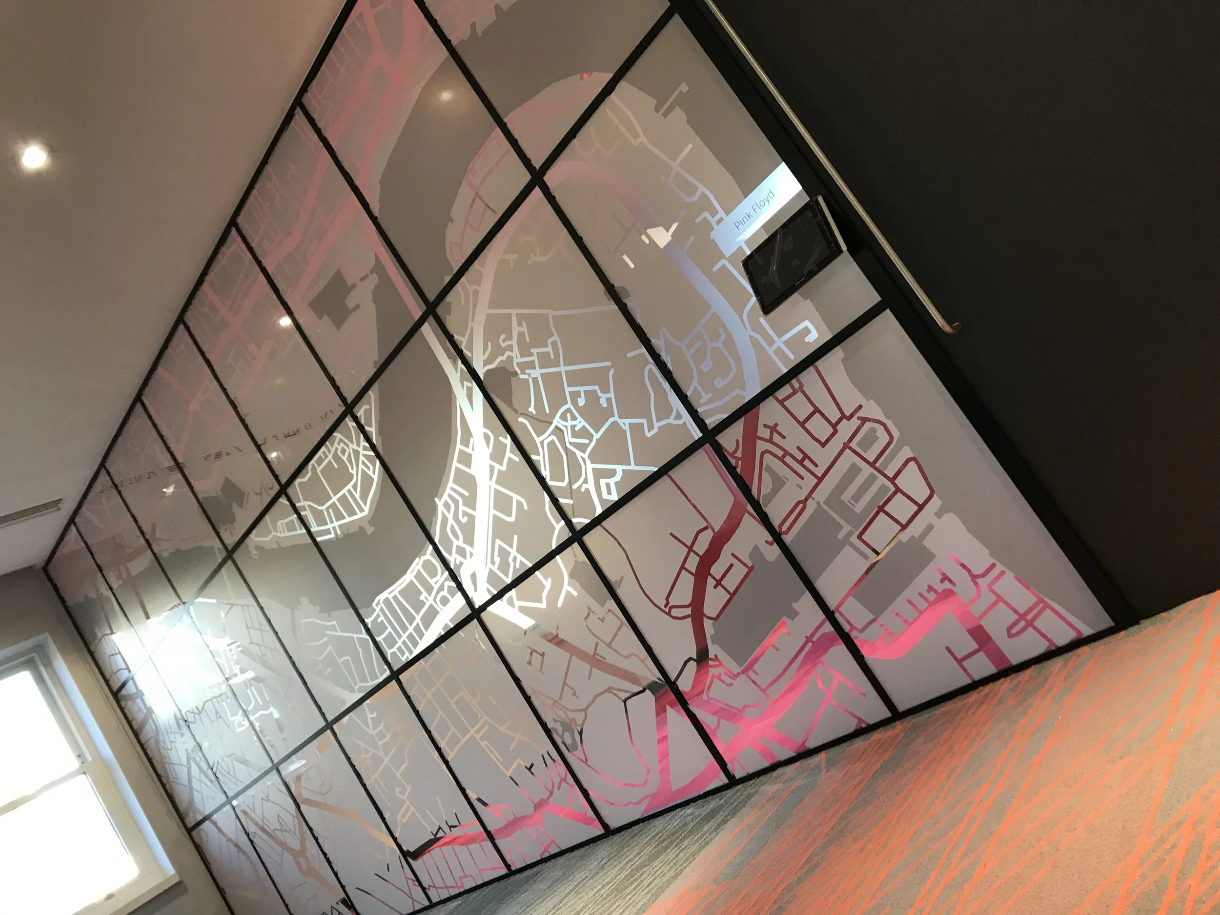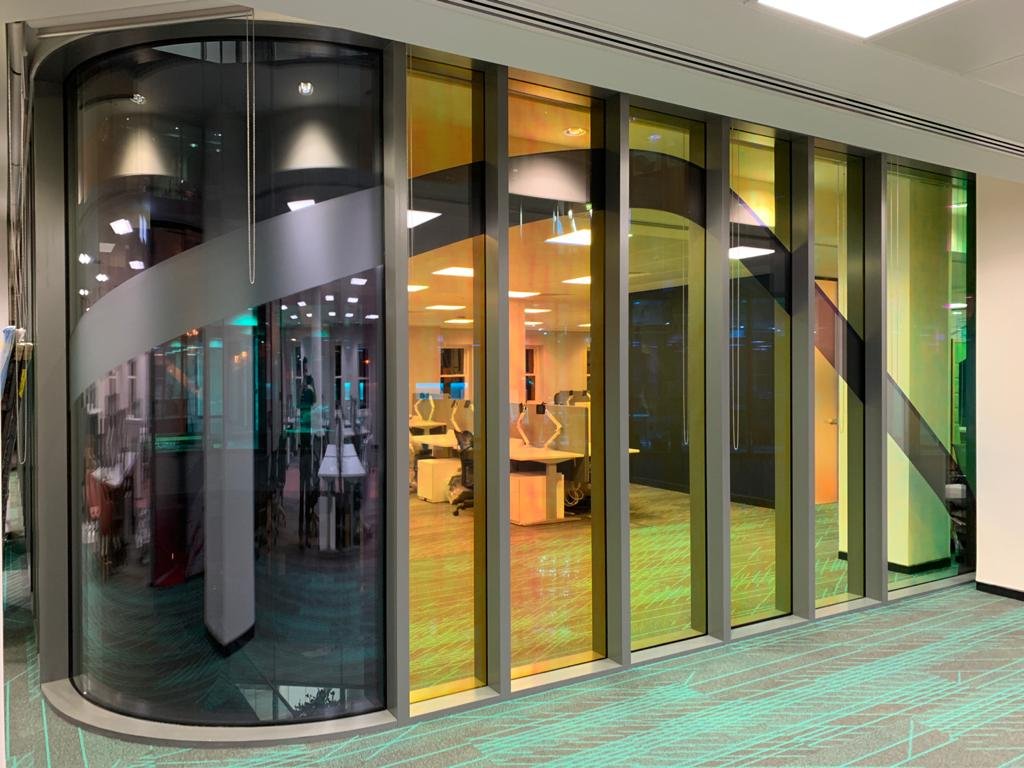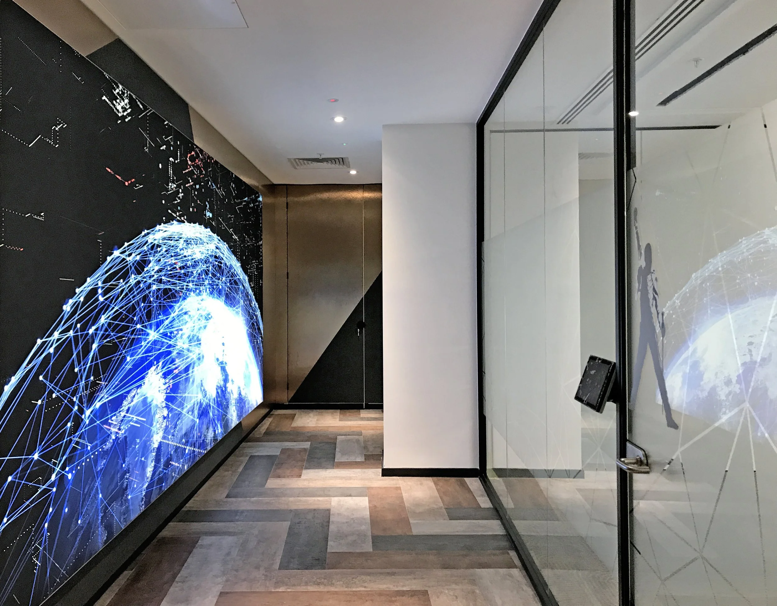 We collaborated with the design team at Tétris on this project at Autodesk’s offices in London. We installed a colour-changing atrium using a dichroic material that splits light into different wavelengths as you walk by – so you have to walk around this space to fully appreciate the effect! The meeting rooms rocked music-themed manifestations and we also installed a showstopping feature wall illuminated by a 5m-wide fabricated light box.