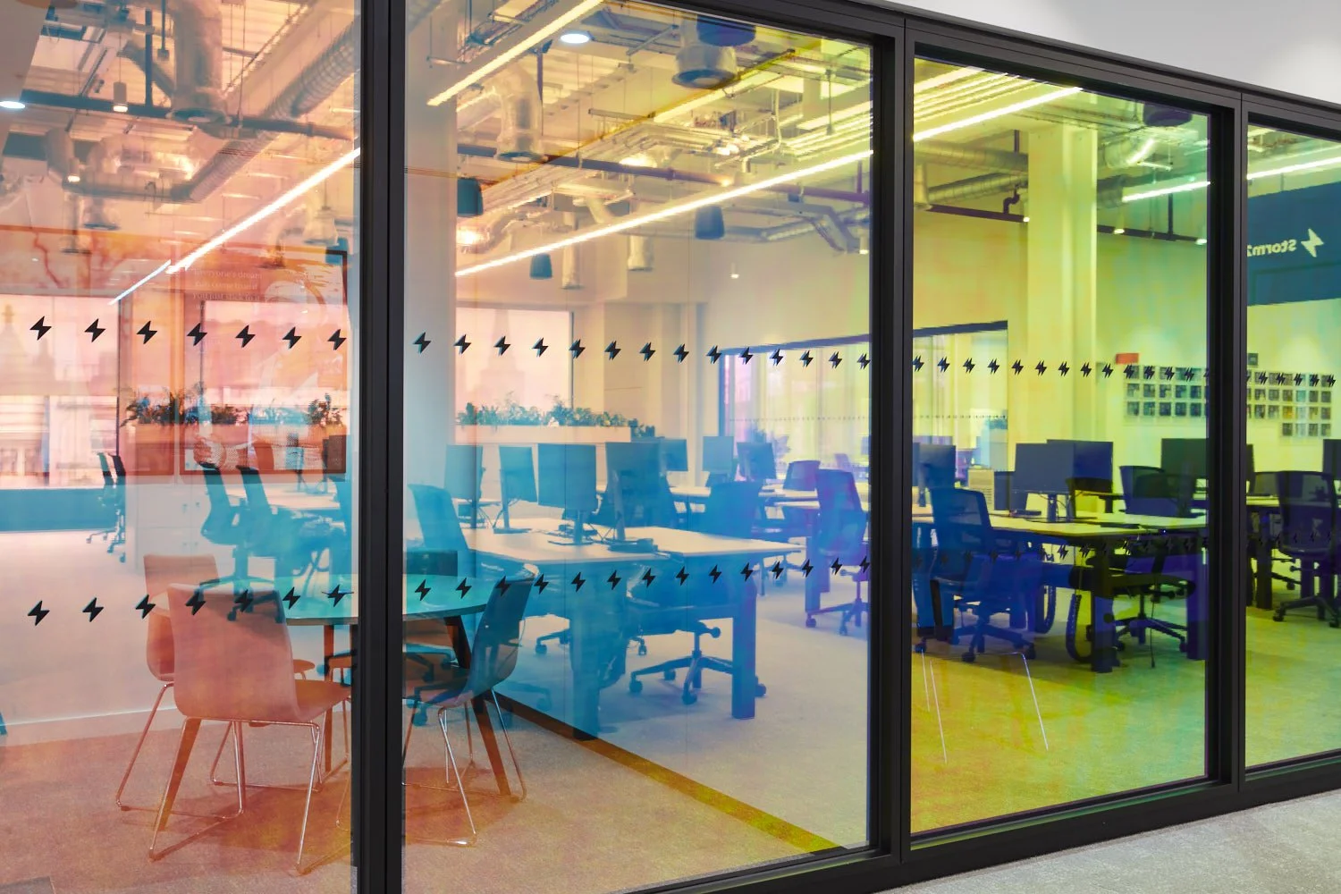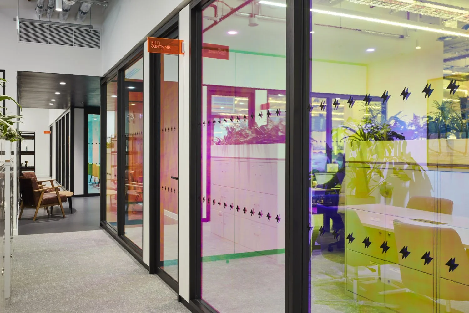 In collaboration with the interior design team at DouglasJane Studio, we installed dichroic film to all the glass at Levin’s offices to create an ever-changing office environment, where the incoming external light, the angle the glass is viewed at and the time of day influence the colour of the glass. We also installed bright orange acrylic blade signs with engraved office names, completing a high-impact look that reflects the energy of the Levin brand.